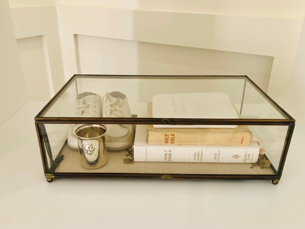 I love this glass shadow box for the heirloom items. It also keeps the pewter shiny – the humidifier tarnishes those pewter items quickly!