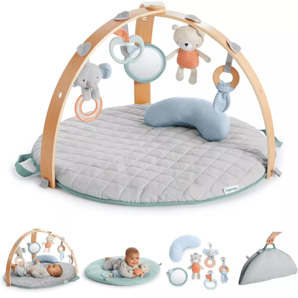 I am a minimalist and really have a hard time buying baby playtime gear because they just grow out of them so fast!! The two things I did keep after the first baby though were the Baby Delight bouncy seat and the Ingenuity Cozy Spot Activity Gym.